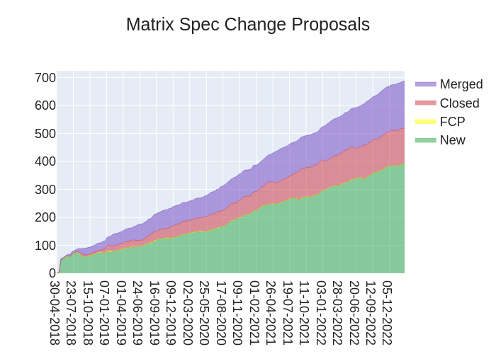 This week and the week afterwards, the Spec Core Team are mostly focused on improvements to Matrix that we'd like to show off at FOSDEM 2023 this year! That consists of MSCs related to Faster Room Joins (MSC3943 among others) and Extensible Events (MSC1767).