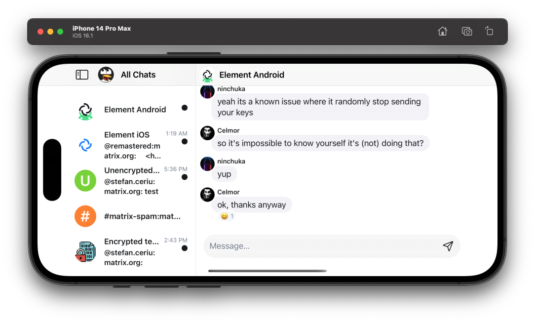 Work on Element X is making great progress, weโre even looking at how to improve the iPad and desktop view for users on larger screens.