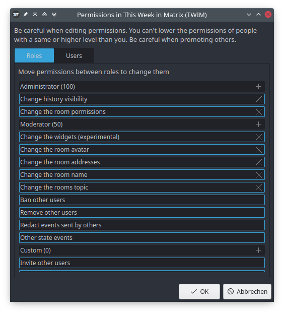 With this the feature set I wanted to have for the next release is complete. I wanted to focus on improving moderation and room management capabilities in Nheko and it does now have a very basic sets of capabilities to do so. I do already have plans to expand on them though!