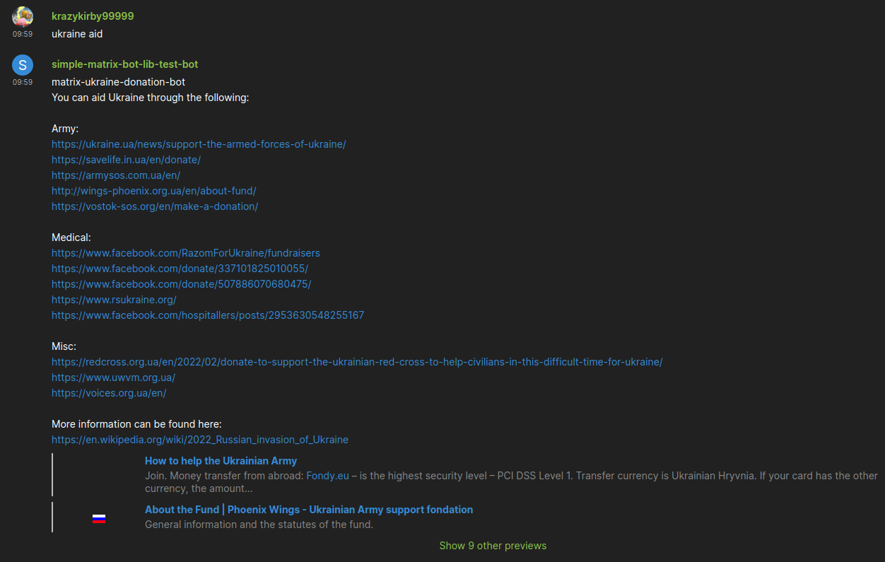 A Matrix chat bot to send donation links to aid Ukraine in the 2022 Russian invasion of Ukraine.