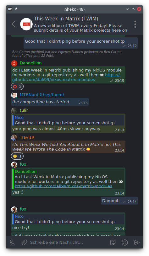 Apart from that Nheko now has support for hidden read receipts (thanks to symphorien, see MSC2285). ZenWalker updated our usage of deprecated gstreamer APIs. Malte has been spending a lot of effort on improving the scrolling experience on the PinePhone as well as allowing to search on mobile. Forwarding should now work properly again as well as calling on mobile and we fixed a small memory leak when opening some dialogs.