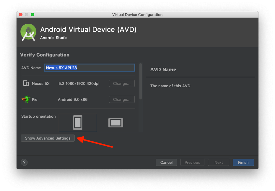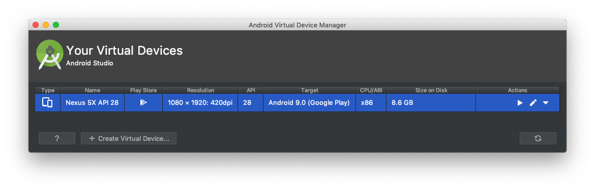 Follow the steps to create a new virtual machine, in this example I have a Nexus 5X running Android 9, but almost any configuration is fine here. Make sure that you give the device access to the Play Store.
