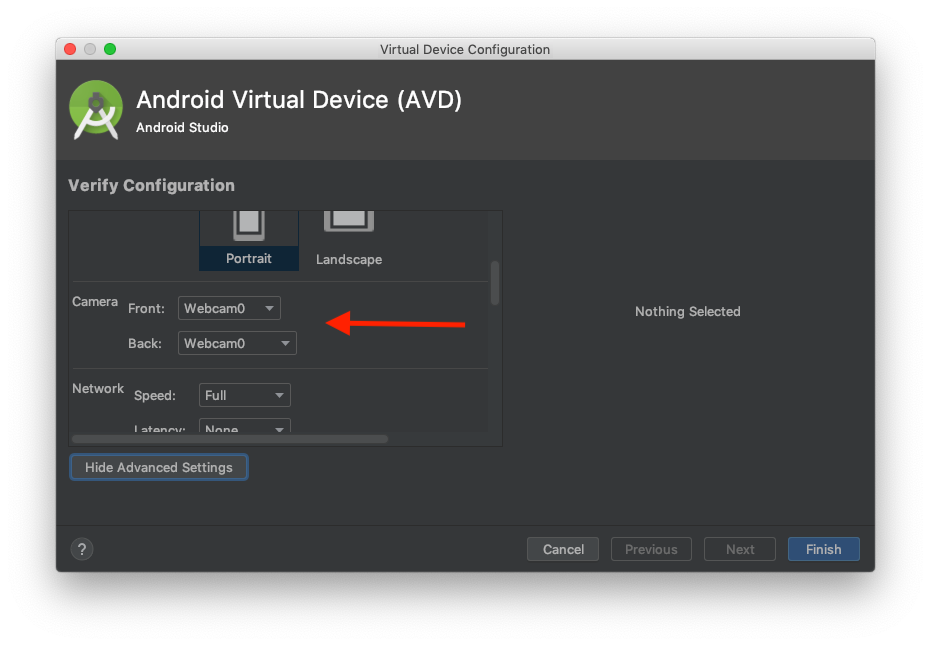 mautrix-whatsapp operates by using the WhatsApp Web feature of WhatsApp - which means it uses a QR code that you must now scan on the device running WhatsApp - which in your case is the AVD. In order to scan the presented QR code, set your AVD camera to passthrough the camera device on your host machine - see the images below.